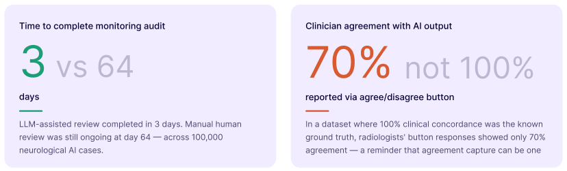 Three days versus sixty-four days. That is the difference Dr. Dean's team observed between LLM-assisted extraction and purely human review when monitoring a neurological AI solution producing over a hundred findings per case across 100,000 cases. At day sixty-four, the human review was still ongoing.